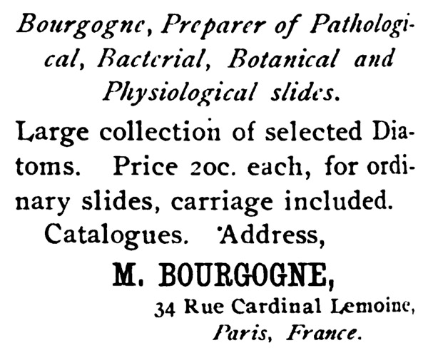 His slides’ quality and “moderate prices” led to a good repuation on both sides of the Atlantic. An 1893 letter to the US magazine The Microscope requesting “Who will put me up a special mount of pygidium of a flea?”, was given the response, “Write to Eugene Bourgogne, 34 Rue du Cardinal-Lemoine, Paris, France, and enclose a United States dollar bill in registered letter. He will sell it to a broker for 95 or 98 cents. Write to him in French if you can. There will be no duty on the slide”.