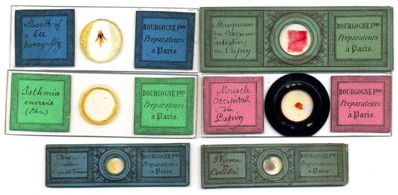Examples of microscope slides that were prepared and sold by Charles Bourgogne. The fully paper-wrapped slides, with patterned papers similar to those of father Joseph, are probably the oldest of these. Charles produced both standard (1 x 3 inch) and smaller continental slides.