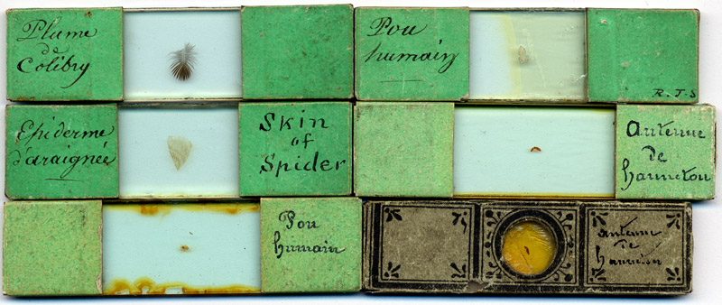 Very rare microscope slides by Hippolyte Pouilliart. His first name is abbreviated as "Hte.". All of the slides are continental-sized slides. The upper left slide, with gold printing on red paper, is printed “1st Choix” (first choice), while the black on green slides are labeled “3rd Choix” (third choice).