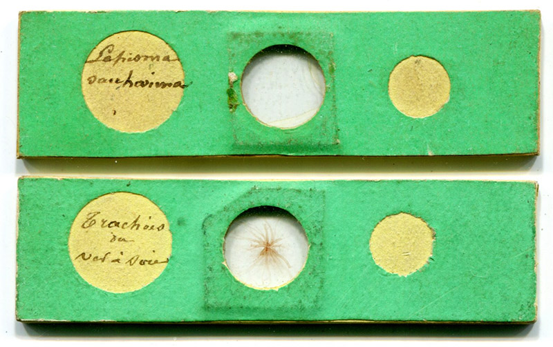 Two small, unsigned microscope slides with Joseph Bourgogne's handwriting. These accompanied a ca. 1857 microscope manufactured by (Georg Oberhaeuser and Edmund Hartnack), Paris. These indicate that Bourgogne supplied unsigned slides for retail by other dealers.