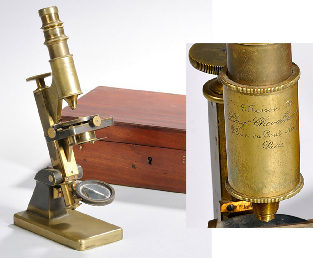 Maison de l’Ingéneur Chevallier compound microscope. Adapted for nonprofit, educational purposes from an internet auction site.
