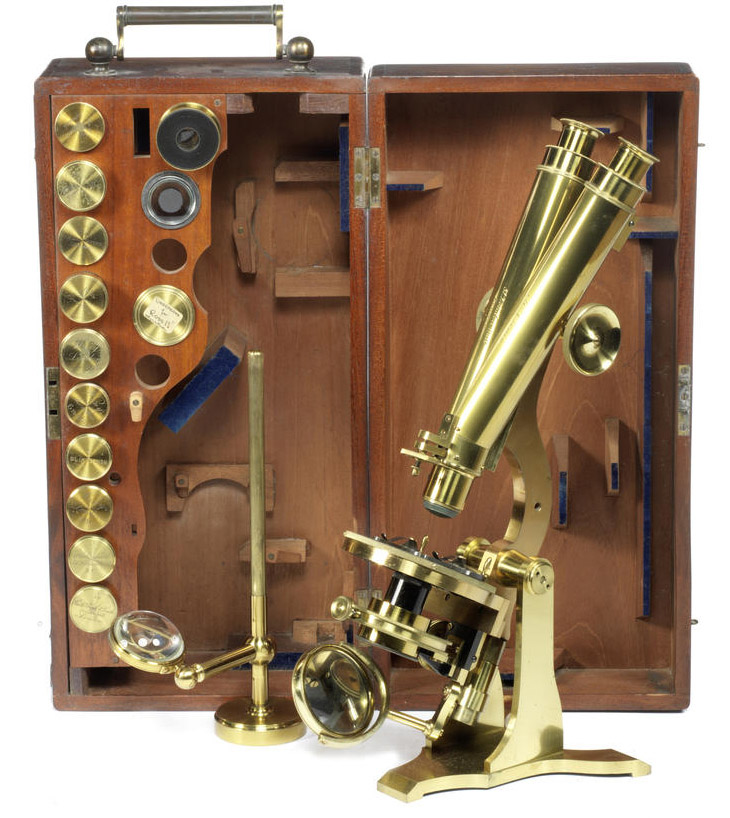 Nickel-plated binocular microscope signed "H and W Crouch, Regent’s Canal Dock London", with serial number 126, dating to 1863-1864.