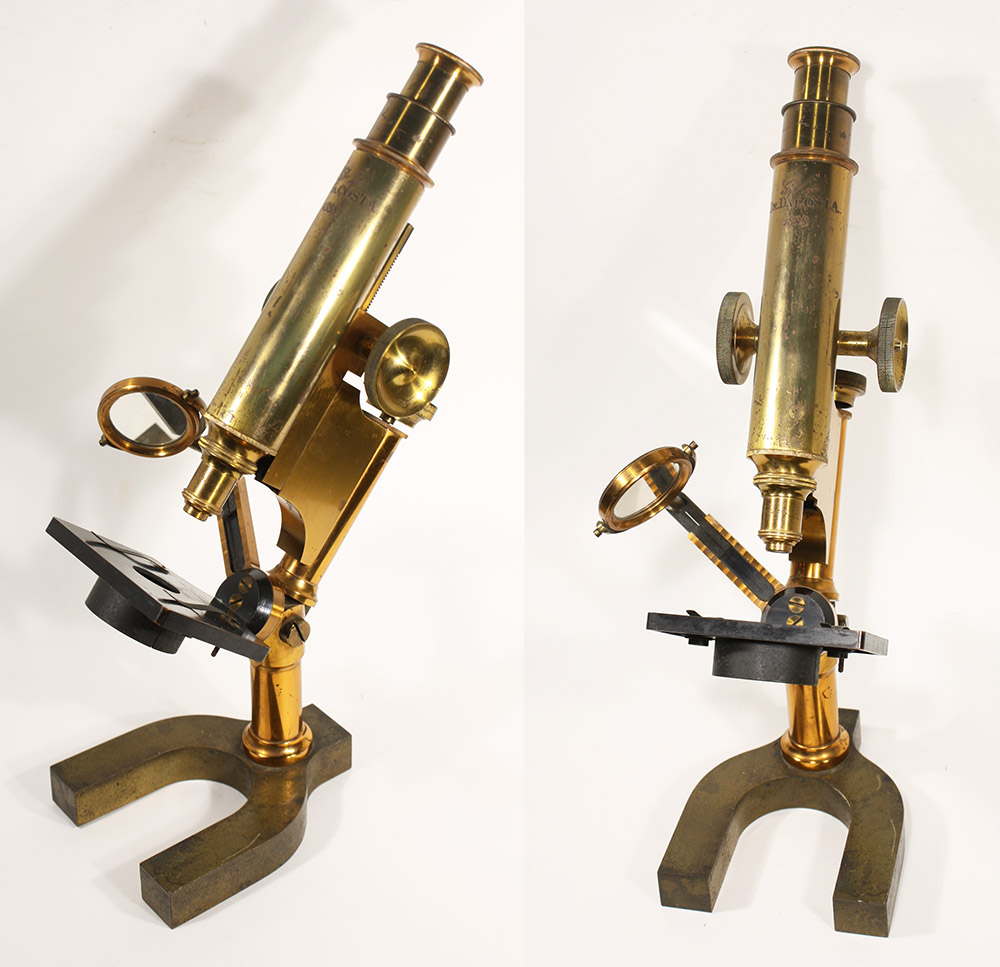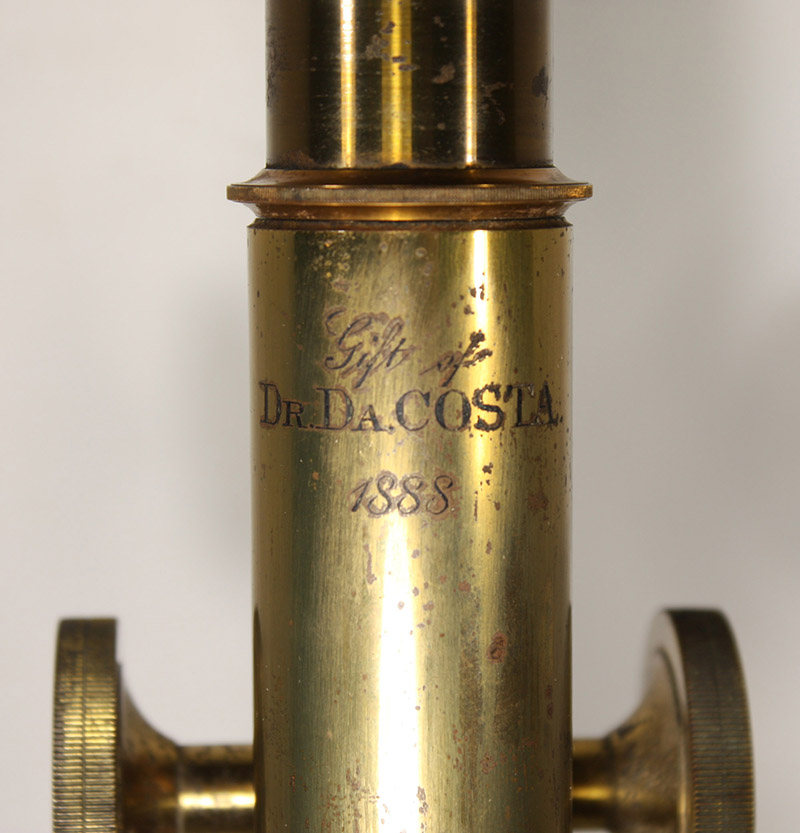 Inscription on the front of the microscope, “Gift of Dr. Da Costa 1888”.