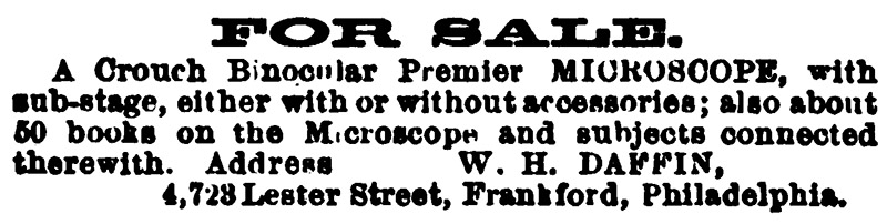 William Daffin sold his microscope and some 50 books on microscopy in 1878. He owned a “Premier” binocular microscope with a substage condenser, which was a very good quality instrument. The Philadelphia retailer J.W. Queen was U.S. distributor for the microscopes of Henry Crouch of London. This advertisement appeared only once in “The American Journal of Microscopy”. The journal misprinted his address as “Lester”, instead of “Lesher”, so one hopes that he was successful with the sales.