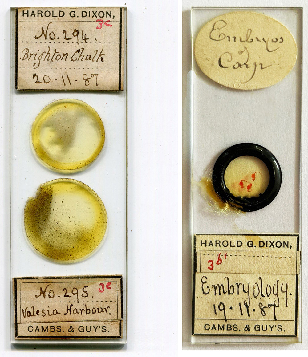 Harold Dixon had only just completed his medical training when he was stricken with debilitating abscesses in his lower back. He spent most of 1884 through 1889 confined to bed in a hospital convalescent ward, but during that time and two brief periods of release, Dixon explored his interests in the sciences. A colleague wrote that the bed-bound Dixon, “used to examine microscopical specimens, and give opinions on slides of bacilli or growths submitted to him”. A number of permanent microscope slides are known that bear Harold G. Dixon’s name (Figure 1). Some were prepared by him, while others were acquired from professional slide-makers for his study. His slides carry labels printed with “Cambs. & Guy’s”, indicating Dixon’s undergraduate education at Cambridge University and his medical training at Guy’s Hospital.