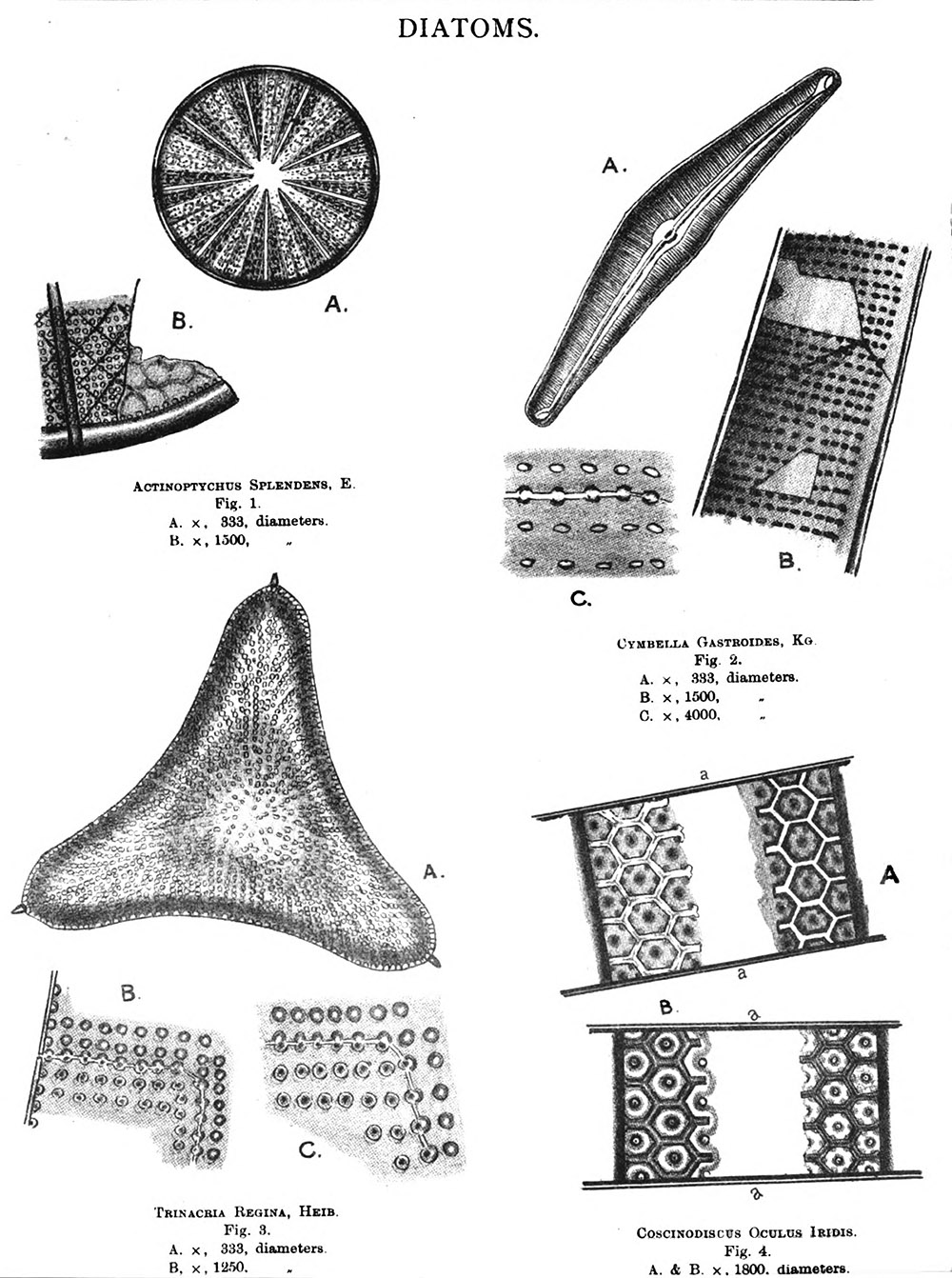 “Diatoms”, drawn by Harold G. Dixon for his 1889 article that was published in “Guy's Hospital Gazette”. He wrote, “I have chosen to sketch valves shewing fractures of their walls, as the fracture gives a little more insight into the character of the areolations.”