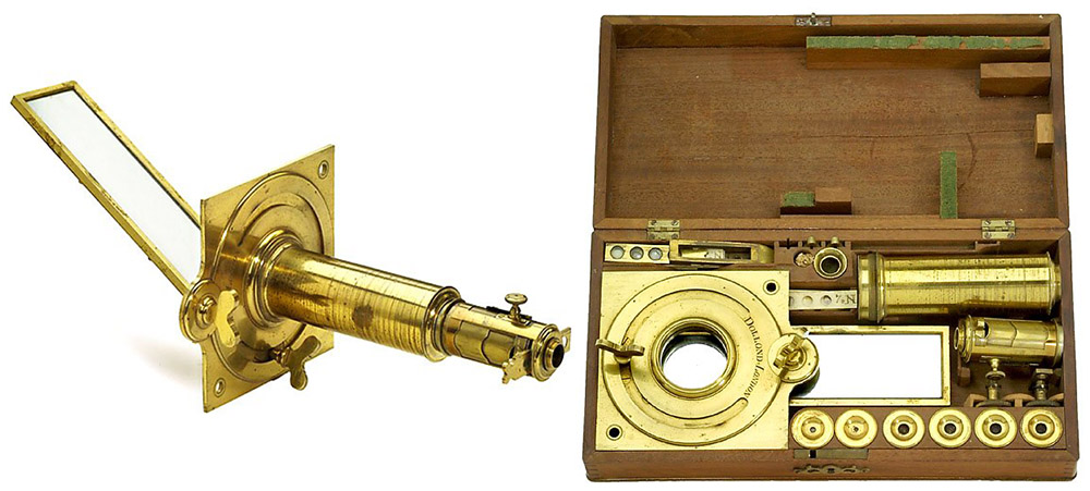 Circa 1838 compound microscope, signed “Dollond, London”. It was probably made on commission by Hugh Powell, before that man established his renowned microscope business. Adapted for nonprofit, educational purposes from an internet auction site.