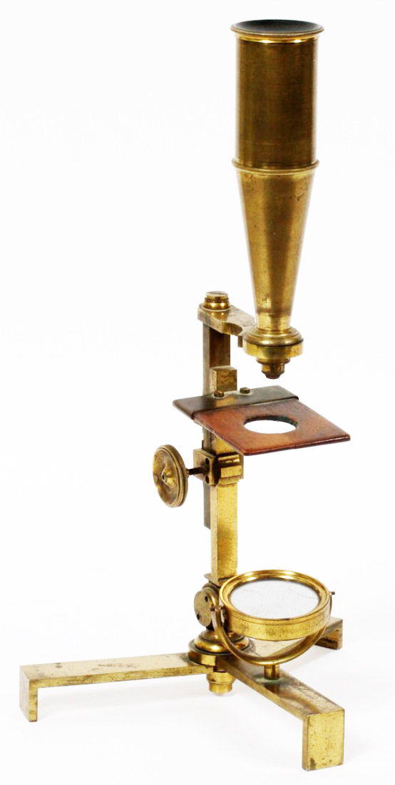 Circa 1820 all-brass “Jones’ Botanical”-type microscope, signed by Dollond. Adapted by permission from "http://www.antique-microscopes.com/photos/dollond.htm.