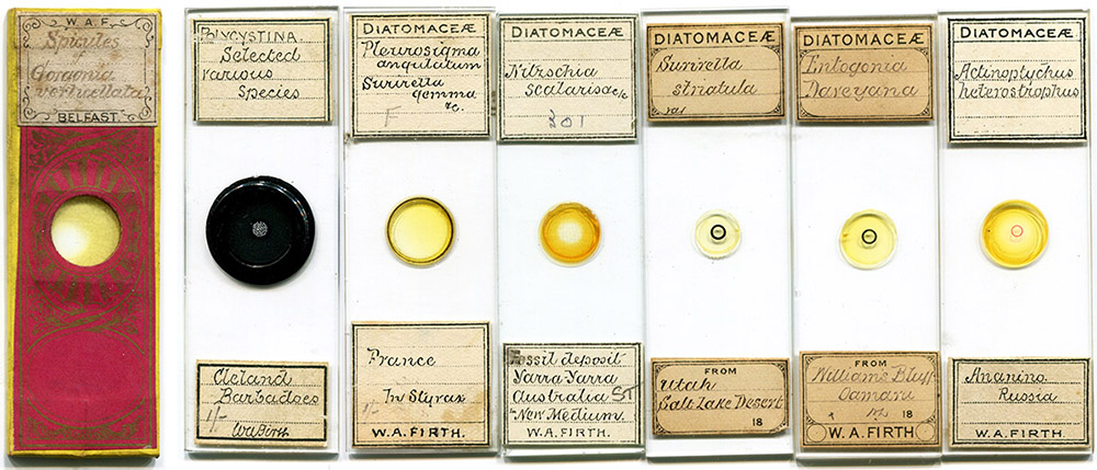 By 1893, William Firth had obtained substantial skill in preparing microscope slides of diatoms. That year’s Proceedings of the Belfast Naturalists' Field Club gave an award, “to William A. Firth for his very superior slides of grouped diatoms, &c, a set remarkable for the amount of manipulated skill displayed in each separate slide, as well as in the taste and general excellence of the entire set”.