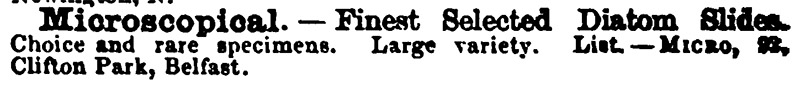 An 1897 advertisement for the sale of microscope slides. From “English Mechanic and World of Science”.