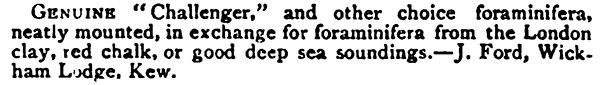 Exchange advertisement from 1890, offering foraminifera from the H.M.S. Challenger’s sounding expedition.