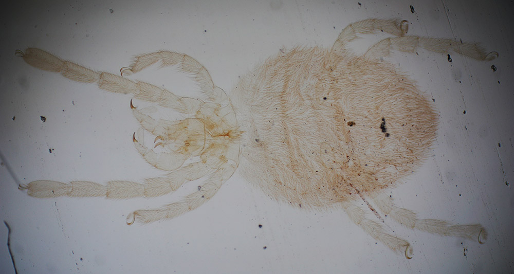 Trombidium holosericeum (red velvet mite), prepared by Henri Gallot in 1899 (see Figure 1). Imaged with a C-mounted digital SLR camera and 3.4x objective lens on a Leitz Ortholux II microscope.