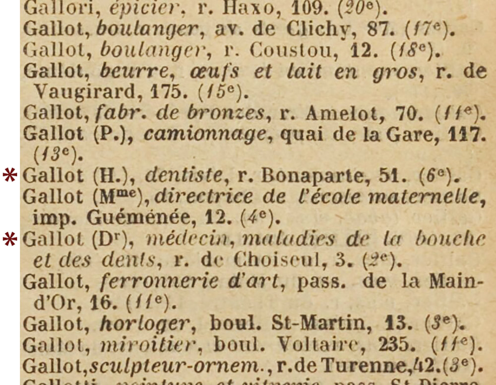 The 1909 Annuaire du Commerce Didot-Bottin indicates a change in location (Figure 4). It lists the dentist H. Gallot at 51 Rue Bonaparte, and a new entry for Dr. Gallot who treated “diseases of the mouth and teeth” at 3 Rue de Choiseul. Additional information described below show that the Dr. Gallot at Rue de Choiseul was our microscopist Henri Gallot. This was the last entry for Gallot of Rue Bonaparte. I conclude that both entries are for our microscopist. Later publications indicate an address change from 3 to 1 Rue de Choiseul during the early 1930s.