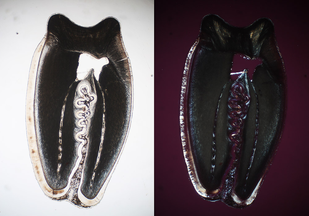 Section through a rabbit's tooth, prepared by Henri Gallot (see Figure 1). Imaged with a C-mounted digital SLR camera and 3.4x objective lens on a Leitz Ortholux II microscope, with standard transmitted light (left) and between crossed polarizing filters (right).