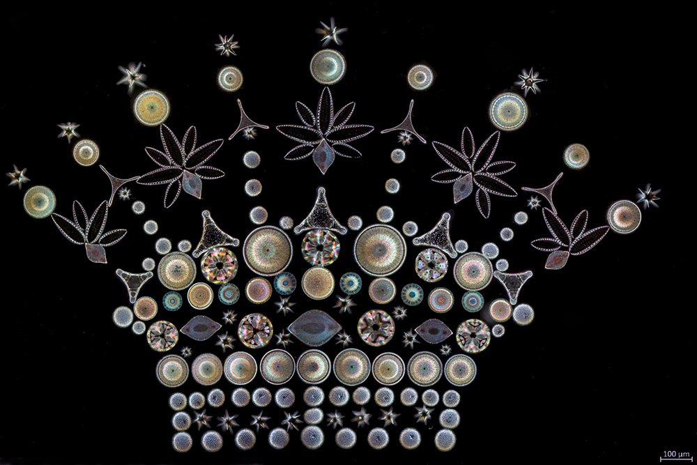 An arrangement of diatoms by William Gatrell. Photographed using top lighting. Image generously provided by Ian Jones.