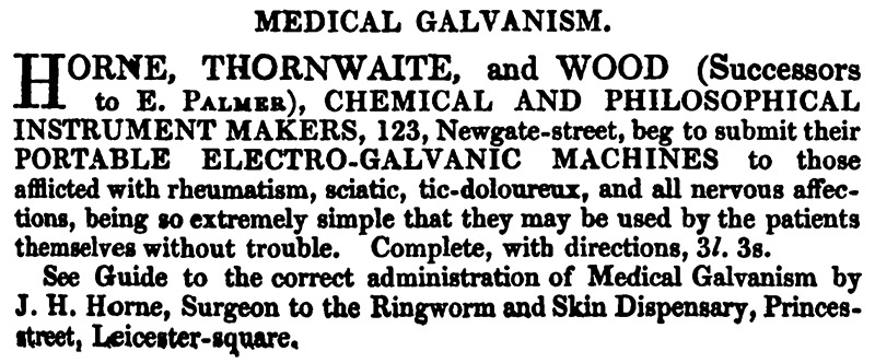 The London Medical Directory (1846) Advertisement from Horne, Thornthwaite, and Wood for medical galvanism, page 21
