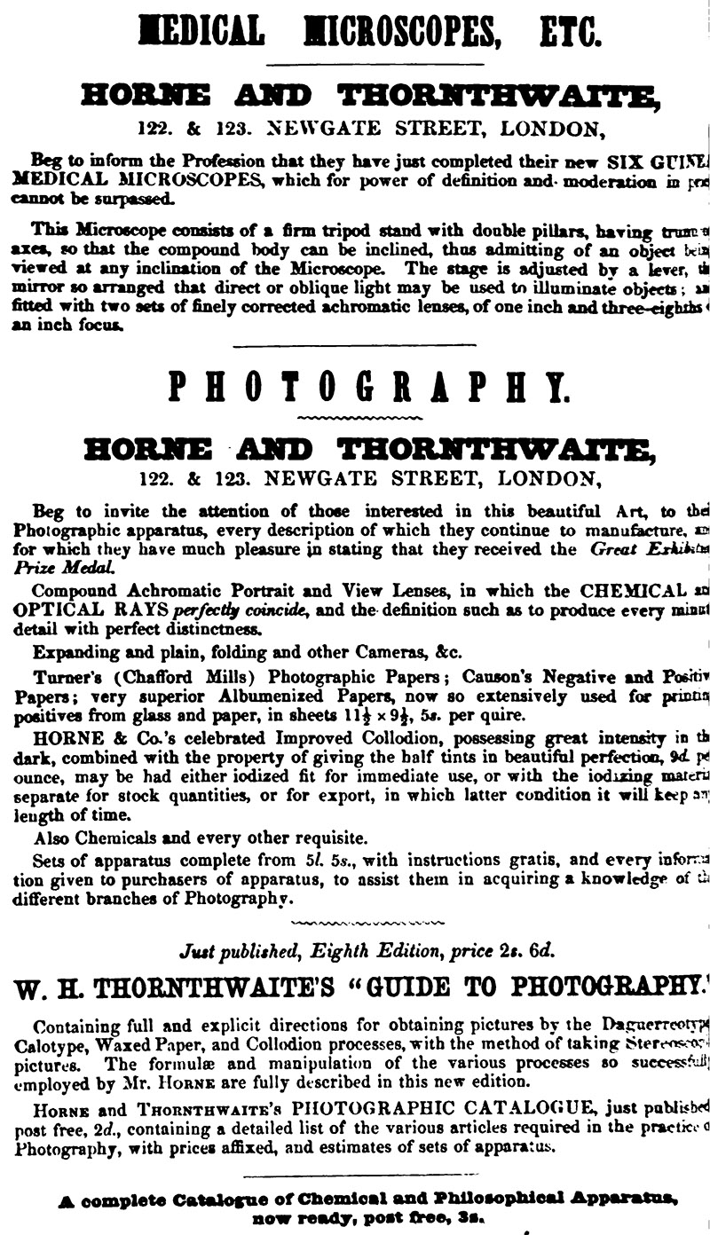 As did most other major British manufacturers and retailers, Horne, Thornthwaite, and Wood exhibited at the 1851 Great Exhibition of the Works of Industry of All Nations. Their entry lists, “Dissolving views. Transparency of the moon. Electrogalvanic machine, &c. for medical galvanism. Oxy-hydrogen microscope. Daguerreotype and calotype apparatus and chemicals. Agricultural drainage-levels, galvanometer, &c.” and “Smee's optometer, for ascertaining the refractory humours of the eye, and the required focus of spectacle glasses”. They were awarded a Prize Medal for their “camera with a double achromatic object glass, whose aperture is about 2 1/2 inches. The size of the picture is 8 by 7 inches. The frame allows of two papers being placed in at one time. The box is made to fold together, and is a fine specimen of beautiful, neat, mahogany work, with many good contrivances to keep out light. There is no speciality in the construction of the daguerreotype and calotype apparatus of these exhibitors, excepting a mode of iodizing and bromizing the plates, by sliders of great neatness; the exquisite workmanship of their several articles; and the general arrangements for their use in daylight. Some very fine specimens of chemicals used in the process of photography are also exhibited”.