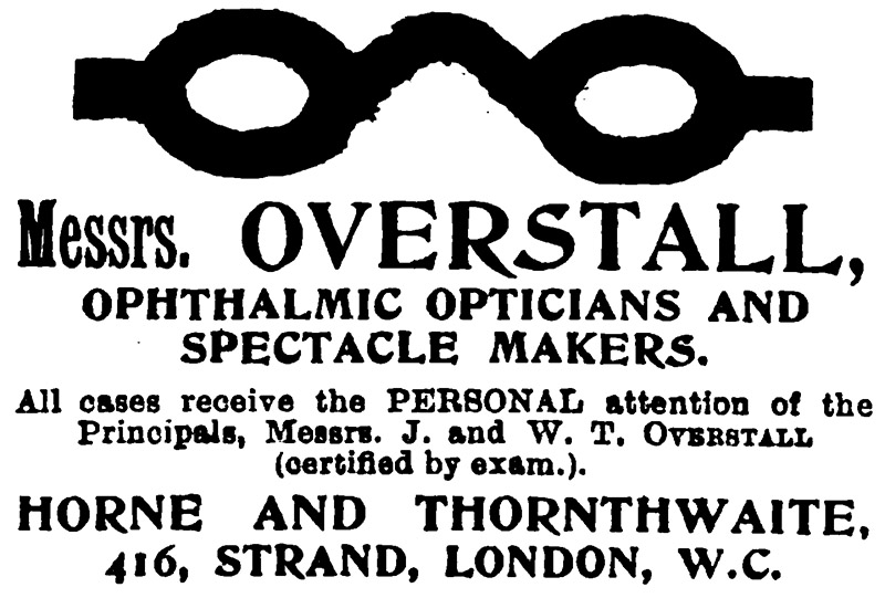 An 1897 advertisement from the Guardian (London). One or both of the Overstalls had taken over Ackland’s service of examining eyes.