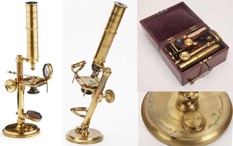 Horne, Thornthwaite, and Wood compound microscope, with address 123 Newgate, ca. 1844-1850. http://www.antique-microscopes.com/photos/HTW.htm.