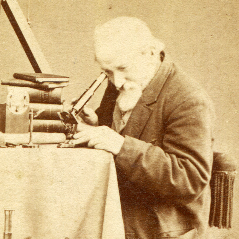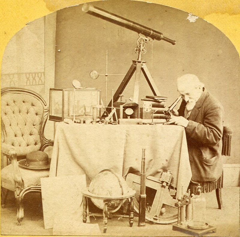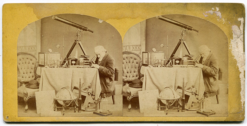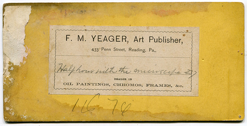 Stereoview of a gentleman peering into a microscope, surrounded by a wide variety of microscopical and other scientific equipment. Produced ca. 1890 by F.M. Yeager, Reading, Pennsylvania, USA, it is entitled "Half Hours with the Microscope" (evidently coopted from the popular book of that title by Edwin Lankester and Tuffen West).