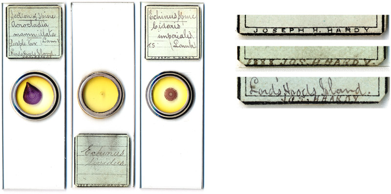 An amateur microscopist, Joseph H. Hardy undertook to prepare slides of thin-sectioned echinoderm spines. His known slides are of very high quality, both macroscopically (Figure 1) and microscopically (Figure 3-7). The spines of sea urchins and other echinoderms are difficult to prepare in cross-section, as they are hard enough to require the same sort of hand-grinding necessary to prepare thin-sections of minerals, yet so fragile that a misstep can destroy their fine structure. Exactly why a railway clerk such as Hardy decide to specialize in echinoderms is not known, but by the turn of the 20th Century, he was an internationally recognized expert.