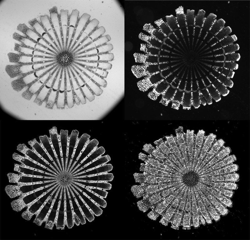 from upper left, brightfield, darkfield, phase contrast 1 and phase contrast 3.