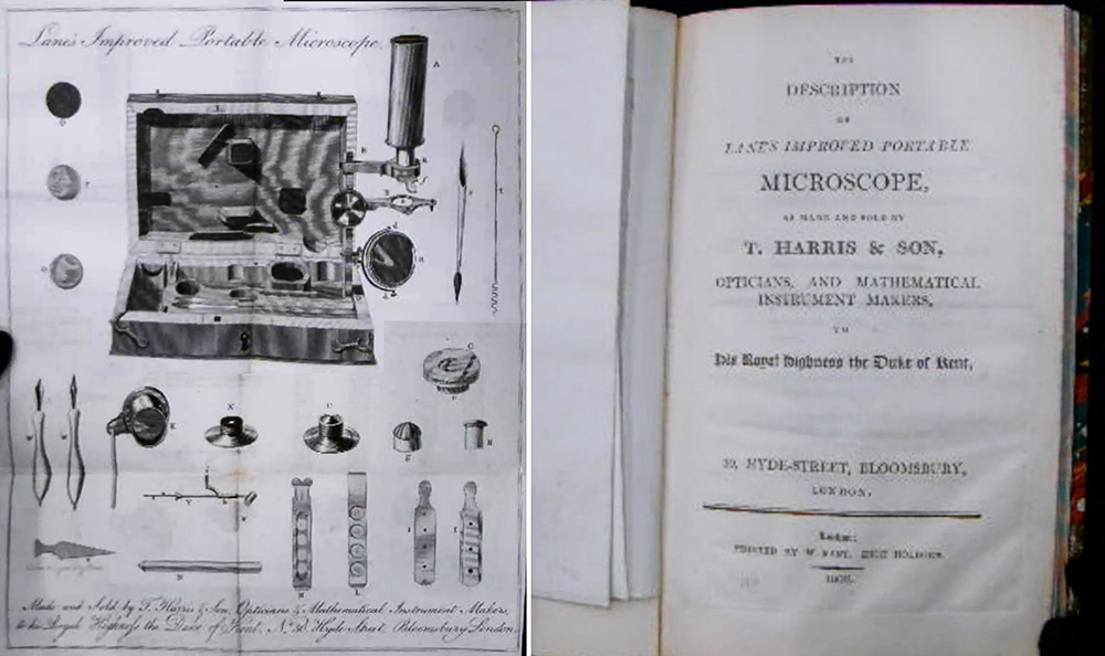 In 1806, Harris published The Description of Lane's Improved Portable Microscope, as Made and Sold by T. Harris and Son (Figure 3). This described their version of a microscope that evidently was developed by Timothy Lane (1734-1807), an apothecary and scientist (Figures 1-3). At least one other manufacturer produced Lane-type microscopes at that time, so Harris’ use of the word “improved” may have been used to imply that theirs was the best.