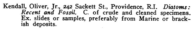 The Naturalists’ Directory was an efficient means to locate other amateur and professional scientists in a geographical region or a specialty, from which one could arrange exchanges of material and ideas. Kendall’s 1914 and 1919 entries stated that he was interested in recent and fossil diatoms and sought to exchange “slides or samples, prefereably marine or brackish deposits” (Figure 3).