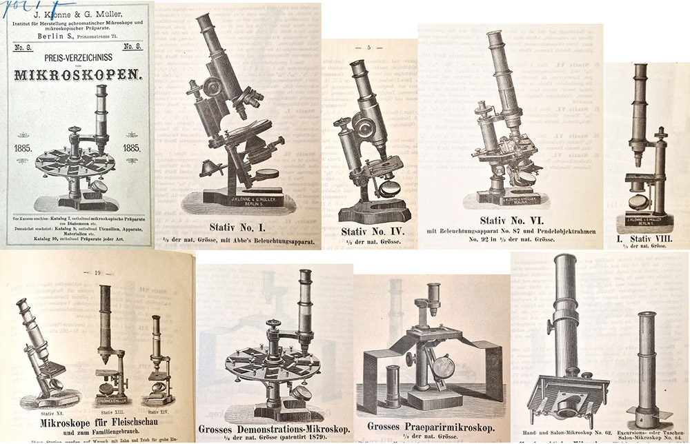 Before the partnership formed, Julius Klönne operated a book publishing and retailing business. In 1876, Gustav Müller joined him, and the partners began to also sell microscopes, slides, and supplies. This implies that Müller possessed microscope-making skills, perhaps having recently left one of the high-quality manufacturers of Berlin. The business initially retailed slides that were prepared by H.C.J. Duncker - it is not known whether they continued to bring in slides from outside makers, or produced them in-house. Klönne died in 1880. A few years later, Müller sold the publishing/bookselling business while retaining the microscopy side. He maintained the name “Klönne und Müller” through at least 1921, the date of the last known reference to the company. Figures 7 onward trace Klönne’s and Müller’s businesses through advertisements and other publications, many of which illustrate the microscopes that they produced.