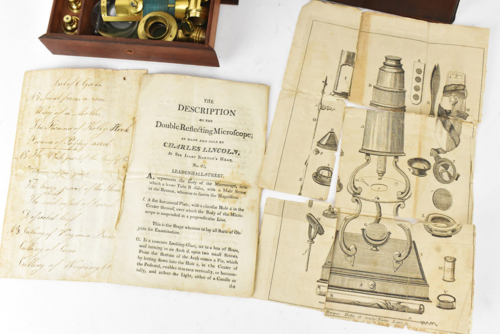 Charles Lincoln’s ca. 1770 booklet that described his Culpeper-type “Double Reflecting Microscope”. The word “double” refers to this being a compound microscope, as opposed to a single-lens simple microscope, while “reflecting” refers to the use of a mirror for illumination, as opposed to a solar projection microscope.
