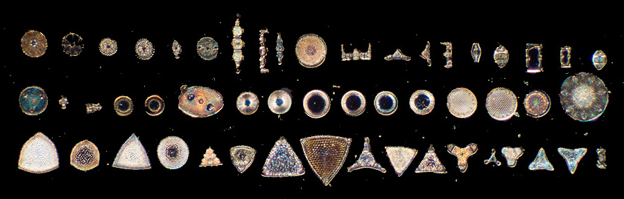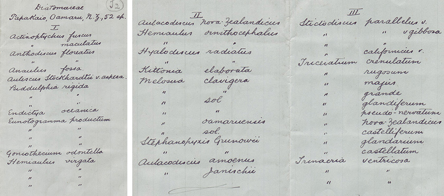 The original species list and images of this slide are shown below (Figures 12-14). Long has skilfully and attractively arranged the species in three rows. Some of the species are presented in different orientations to illustrate the frustule morphology. PapaKaio (also known as Flume Gulley) is one of the sites at the famous diatomite deposits of Oamaru, New Zealand. Bill Dailey, on his web page Oamaru Diatomite Collection Sites, describes and illustrates many of the sites.