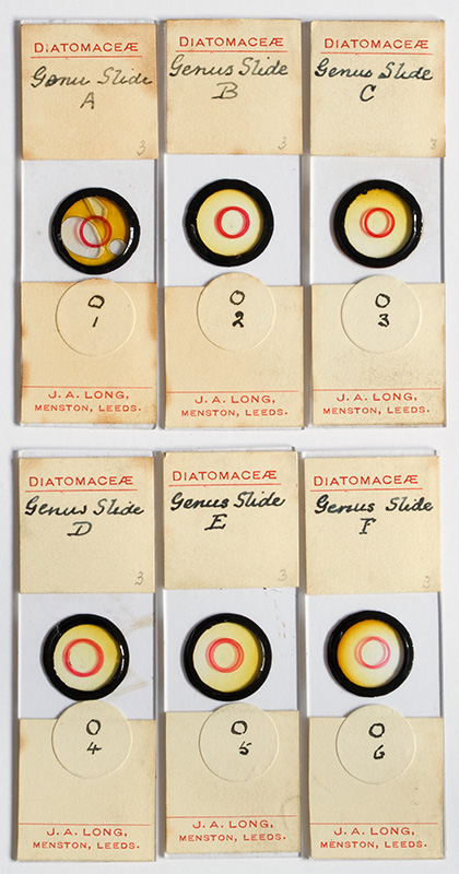 slides, all of Diatoms, made by J.A. Long, Menston, Leeds, dating to