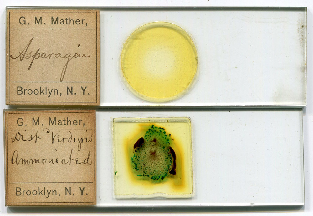 Microscope slides of chemical crystals, prepared by G.M. Mather. His address of Brooklyn dates them to between ca. 1880 to 1891 or between 1897 until his death in 1914.