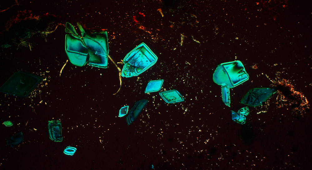 “Distilled Verdigris, Ammoniated” (copper acetate that was treated with ammonia), by George M. Mather (see Figure 1). Images with a 10x objective lens and C-mounted digital camera with crossed polarizing filters on a Leitz Ortholux II microscope.
