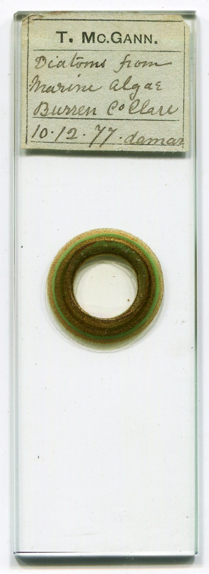 A microscope slide from Terence McGann, prepared in 1877. He undoubtedly sold or exchanged this slide with another microscopist.