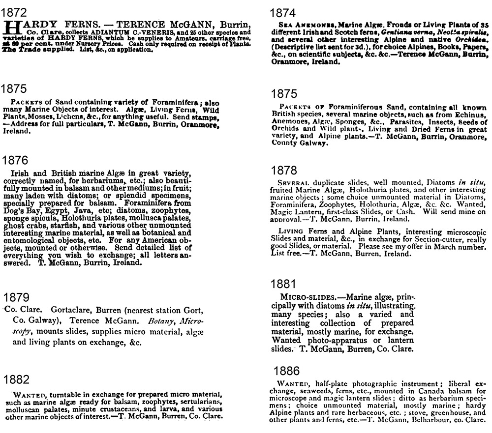 Exchange and sales advertisements from Terence McGann, published in UK and American scientific magazines between 1872 and 1886. He moved to Australia in 1887.