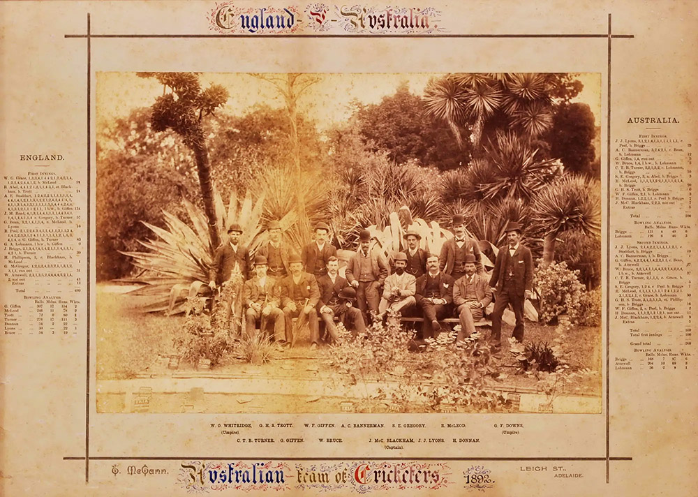 An 1892 photographic production by Terrence McGann, of the Australian Cricket Team. It commemorated test matches between Australia and England, of which Australia won 2 of the 3 tests. Adapted for nonprofit, educational purposes from an internet auction site.