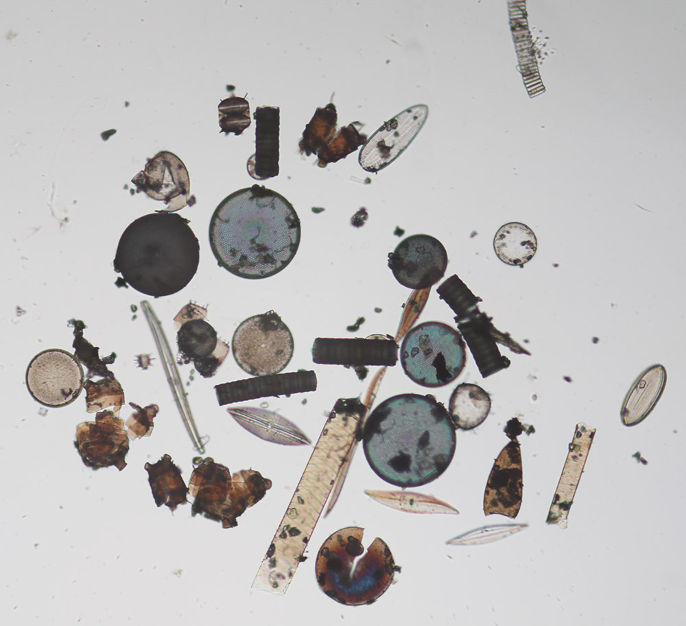 Loosely-arranged selection of diatom species from Mobile Bay, prepared by W.S. McNeill (see Figure 1). A mud sample was repeatedly washed with fresh water over a period of several days, to remove soil and other debris but leave the diatoms intact. Imaged with a 10x objective lens and C-mounted digital SLR camera on a Leitz Ortholux II microscope.