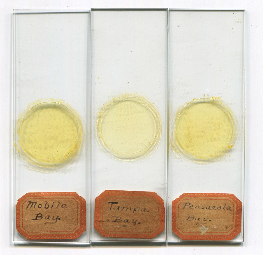 Three microscope slides by an unknown mounter of diatoms from Mobile Bay, Tampa, Bay, and Pensacola Bay. The sites of collection, and construction consistent with the late 1800s, suggests that the specimens were collected by William McNeill and/or his colleagues George Taylor and Kevin Cunningham. They distributed their gatherings to microscopists throughout the US. For additional insights on these slides, please see: https://diatomimaging.com/pensacola-bay-strew-unknown-maker/.