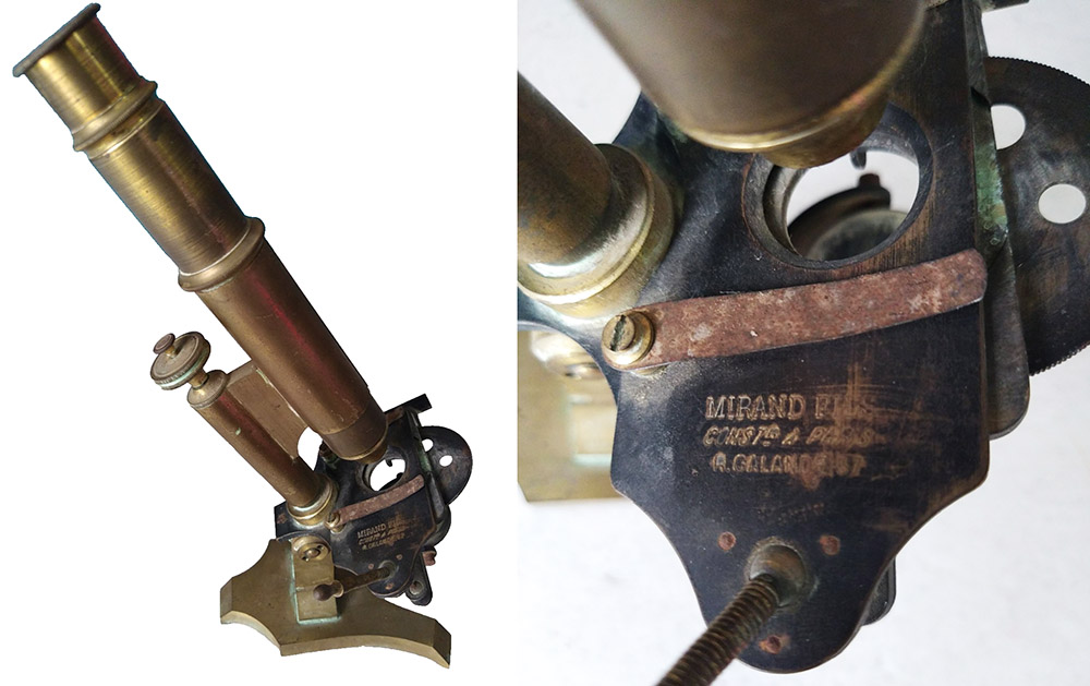 A monocular microscope that is signed “Mirand et Fils”, circa 1870. Adapted with permission from http://www.lecompendium.com/dossier_optique_238_microscope_mirand/microscope_mirand.htm.