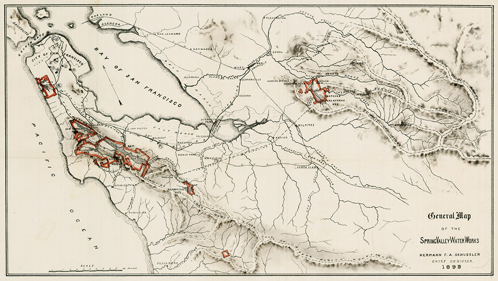 Around 1880, Norris became Secretary of the Spring Valley Water Works, which had a virtual monopoly for delivering drinking water into San Francisco. The company owned water rights in the hills south of San Francisco and across the Bay, and right-of-way to pipe into the city (Figure 6).