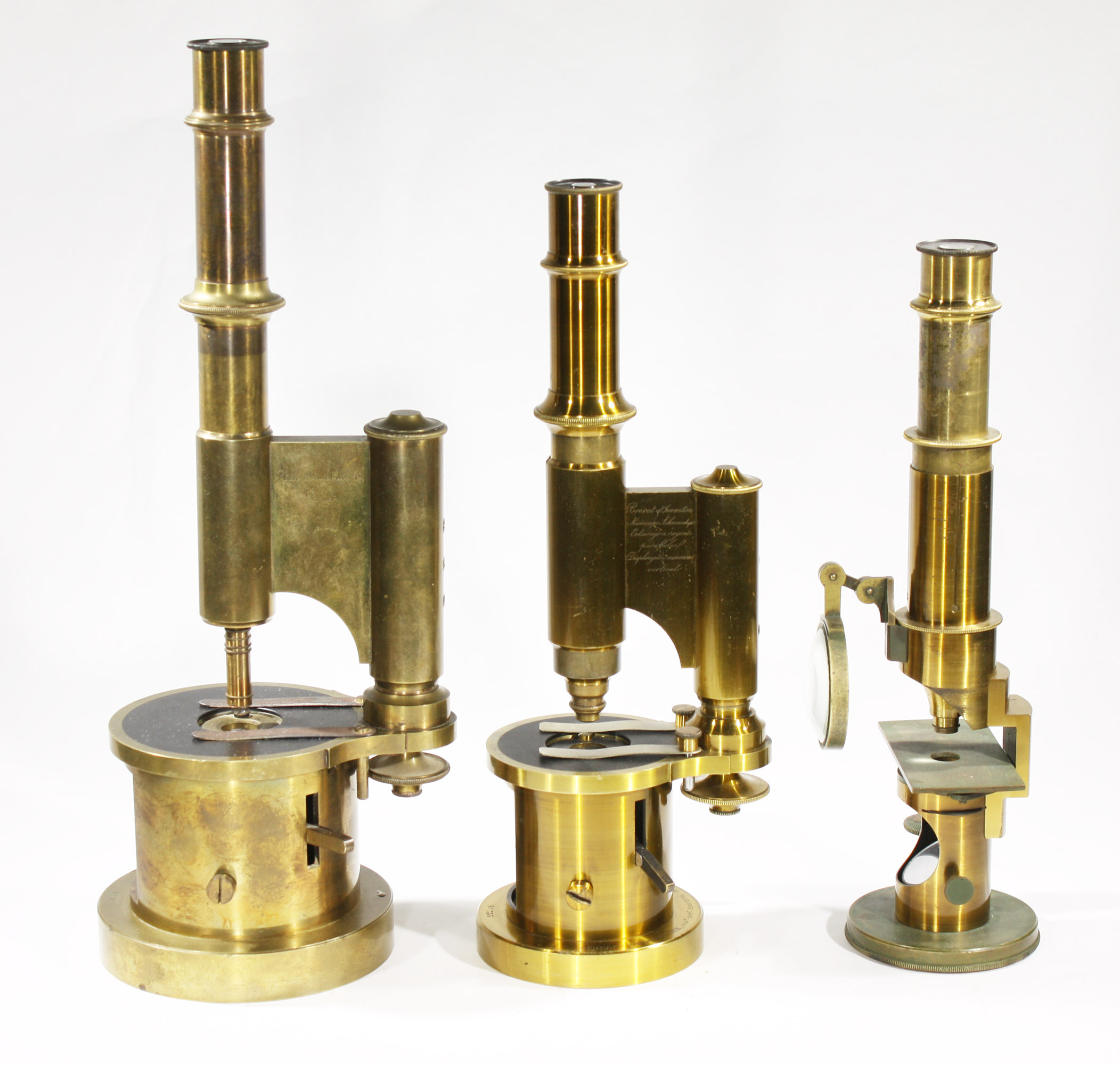 Three sizes of early-/mid-1840s Oberhaeuser drum microscopes. Left to right, serial numbers 1821, 733, and 1249 (see Figures 13A, 8A and 11).