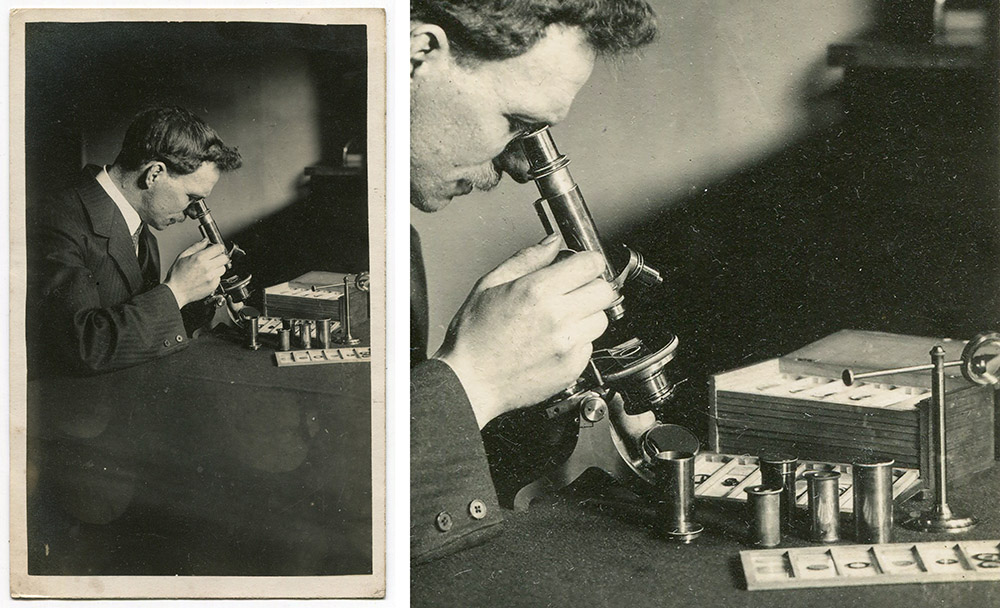 ca. World War I photograph of a scientist with a Nachet Grand Modèle No. 3, at the Municipal Laboratory, Paris, France.