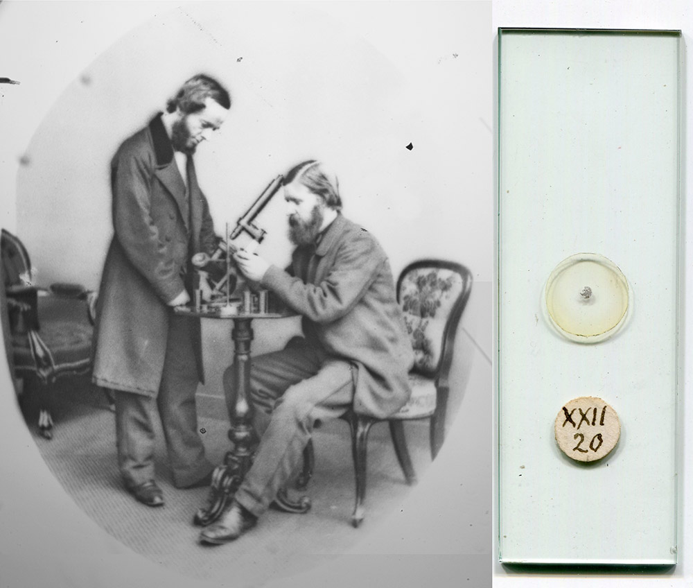Microphotograph of two unidentified men with a bar-limb microscope (probably by Andrew Ross), ca. 1860s.