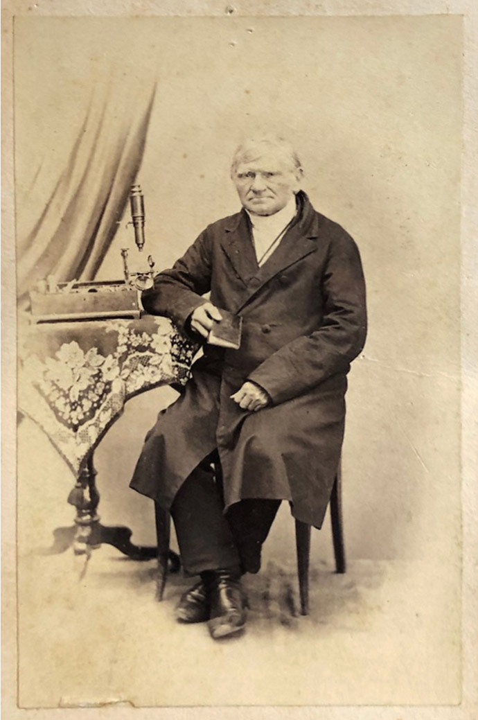 Rev. John Thomas Romney Robinson (1792-1882) and his microscope. Carte-de-visite (CDV). Photographed by James Simonton, 70 Grafton Street, Dublin. Adapted from https://en.wikipedia.org/wiki/Thomas_Romney_Robinson.