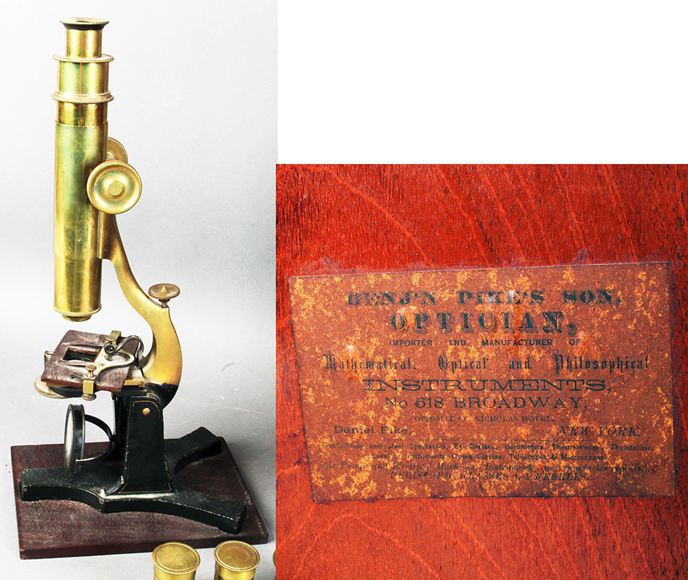 Benjamin Pike founded an optical, scientific, and engineering business in New York, in 1806. It was hugely successful, and operated under various ownerships and names for 110 years. They were one of the pre-eminent makers of corrective eyeglasses in New York. Early microscopes from the Pike businesses were primarily imports from Europe on which they inscribed their name or attached labels. They manufactured some of their own microscopes during the last half of the nineteenth century, while also supplying high-end imports from European makers such as R. & J. Beck.