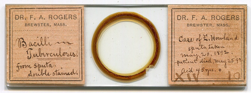 A local farmer named Elisha Howland developed active pulmonary tuberculosis in 1892, and Frank Rogers was evidently his physician. There was not much that could be done to treat tuberculosis at that time. Rogers collected sputum samples from Howland, hoping to observe a reduction in numbers of bacteria. The slide by Rogers that is shown above in Figure 1 notes that the specimen was “double stained”, presumably an acid-fast method such as the recently developed method of Franz Ziehl (1859-1926) and Friedrich Neelsen (1854-1898).