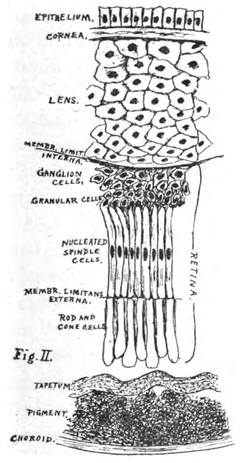 “Diagramatic sketch of the arrangement of the internal parts of the eye (of a scallop), from one pole to the other”. Drawn by Frank Rogers with microscope and camera lucida, to accompany his 1898 paper on “The eye of Pecten irradians or the scallop”. From “The American Monthly Microscopical Journal”.