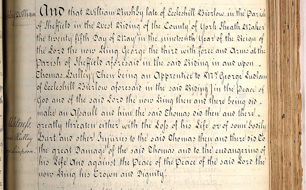 The only other known record of William Rushby’s life: on August 9, 1779, “William Rushby late of Eccleshill (sic) Bierlow … Sheath Maker” was arraigned for assault on Thomas Hulley, and did “greatly threaten either with the loss of his life or of some bodily hurt and other injuries”. The outcome of his trial was not recorded.