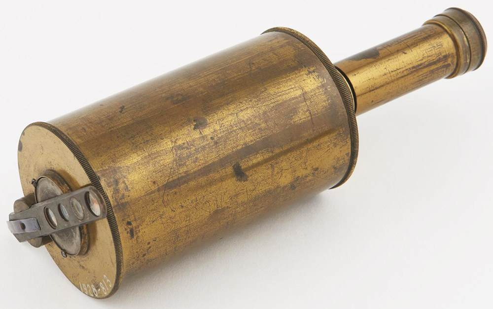 A Smith-type reflecting microscope. Specimens are mounted on the brass slider that can be seen to the left. Clay and Court suggest that it was made by Frederick Herschel (1738-1822). Adapted for nonprofit, educational purposes from https://collection.sciencemuseumgroup.org.uk/objects/co8416/smiths-reflecting-microscope-brass-slide-attache .
